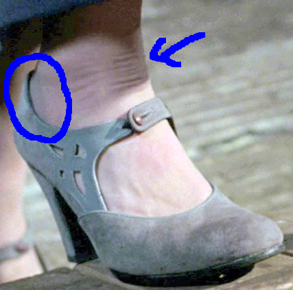 Note wrinkle of hose at ankle and the heel of the hose. |