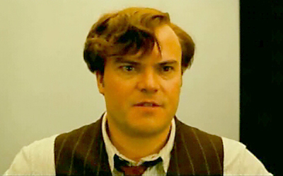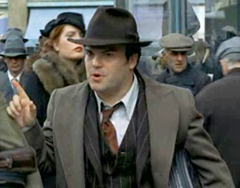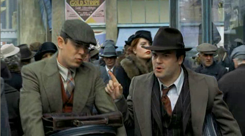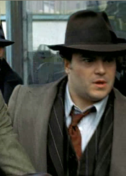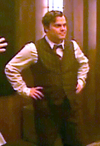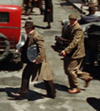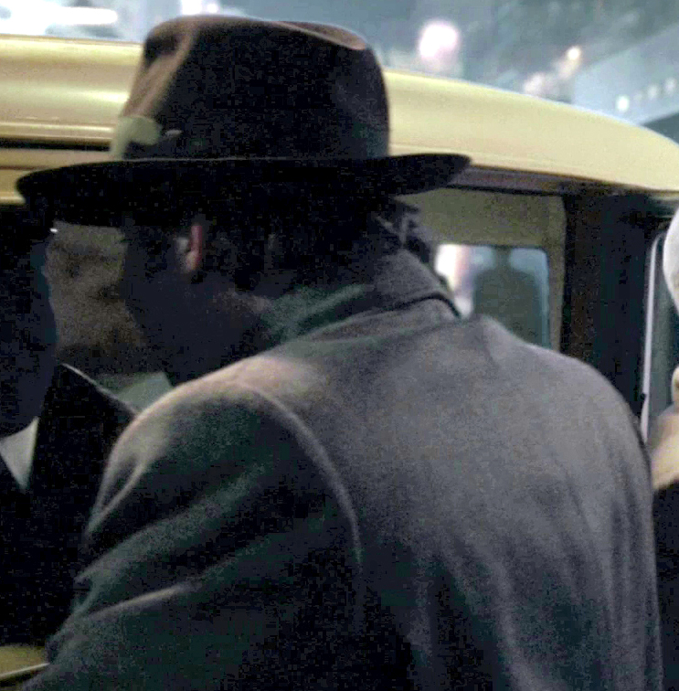 Stealing the film: he's put on his suit coat, hat and tan overcoat.