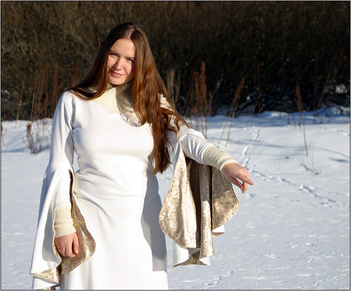 fastened at the elbows. The oversleeves are lined with beautiful beige-shimmery