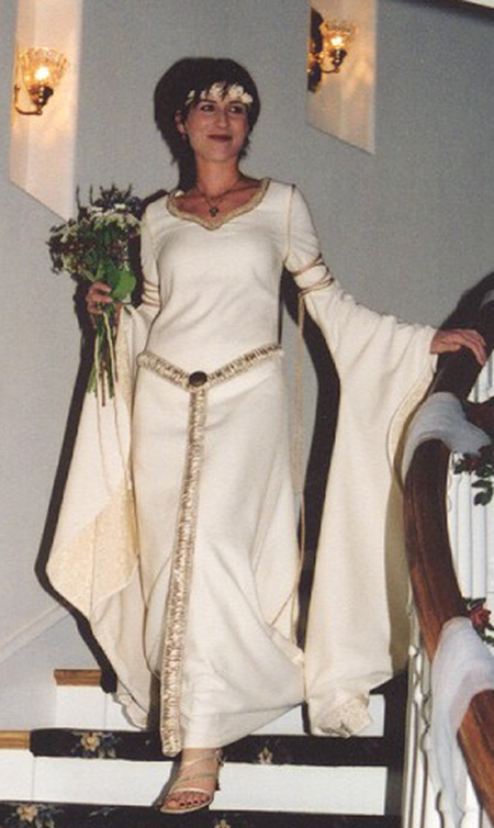 My seamstress used no pattern. She cut the dress freehand from the pictures I showed her. It is made with a fine white wool, lined with raw silk, and a gold patterned brocade lining sleeves and train. She added a longer train for the wedding, though if I had it to do again, I wouldn’t have the longer train. I preferred it as it was in the movie. Also, the dress was so heavy I had a hard time getting down the stairs. For the belt I used a flat woven cording. For the lining around the neck, we used a matte shimmery gold fabric overlaid with another woven trim that I found. It took forever to find just the right color, thickness and style for the cording. My seamstress cut the sleeves in one piece out of the wool. There is a zipper in the back.