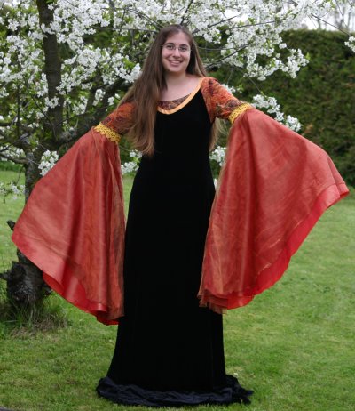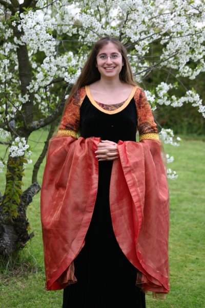 I based the upper half of the sleeves on the pattern for the underdress. The lower sleeves are elliptical half circles. They are two layers of fabric, the lower is a rust red shimmering polyester (it was a curtain) and the upper a golden semitransparent fabric (polyester). Both layers have rolled hems. The band between the upper and the lower sleeve is made of two layers. Over a black velvet band I sewed a strip of yellow crochet trim.