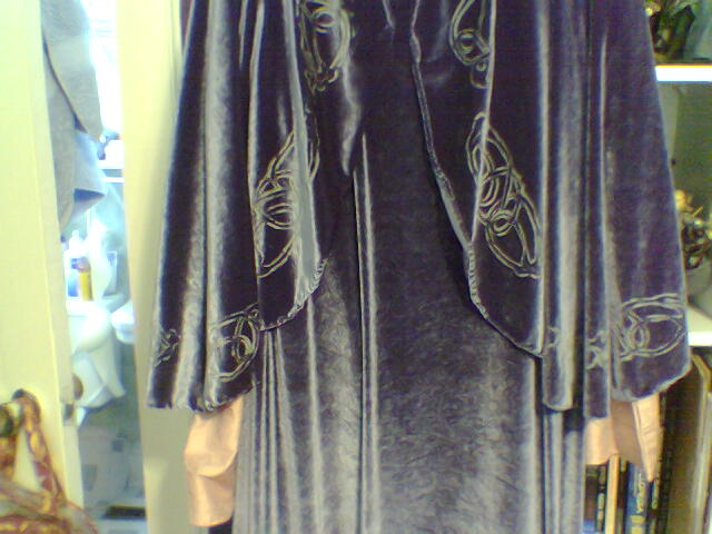 Then I started hand embroidering, I was at a speed o 1"=1 hr not so hot, so I decided to start on the drape, again lots of pictures, and back to Denver fabrics after I made a mock up based on simplicity 5329 (thanks to lots of help from Judy. thanks again Judy!) and wouldn't you know they were out of silk velvet in the charcoal color and I wasn't about to dye anything so I looked at the stretch velvet.