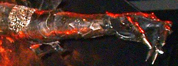 Preliminary description of Sauron's armor from the FIDM exhibit. Standing head and shoulders over al of them is the Sauron armor. It's probably over seven feet tall with helmet and all. It's on it's own wooden base with brass nameplate. I hesitate to call it a costume because it was never meant to be worn. Perhaps the word - CGI COSTUME might be more appropriate. Something to be scanned - not worn. Oh, someone might conceivably wear bits and pieces of it but not the whole thing all together. Too darn spiky and I'm not sure the articulation was as good as it should have been. Armor is very spiky and oddly pieced, shaped, and forged. It has an acid etched pattern repeated over vast areas of the armor. There was a comment that it wasn't black - not quite - more what they used to darken the armor was not an opaque black but more translucent so it came off somewhat deep brownish in areas. (Reminder, film stock causes color changes, like darkening.) The cape is a dark antique gold lame on the outside, black on the inside. Done in layers - about 5 of them - and ending in a point that would be on the ground. It depends, as best I could tell from the shoulder points. It's probably also attached at the neck - but you couldn't see around the back to tell. He had his left arm up and pointing out into the gallery, the right arm was down and holding his war club?, Mace?, sorcerer's staff??? A six bladed/pointed sucker. The leg and arm armor was oddly set up. From what I remember most plate leg/arm armor is articulated at the joints and but everything else is in big unbroken pieces. Sauron's armor had numerous overlapping pieces on the legs and arms - so many that I sometimes got confused trying to sketch them all. Just checking out the sketch - there look to be about 17 segments from the hip to the ankle. The figure had chain mail on under armor on sleeves and legs. He was wearing black leather gloves with the armored hand pieces strapped on at the wrist. I'm not sure if the hand piece fit over the glove at the fingers or was attached to it. Similar to the Ring Wraith's hand armor but simpler in some ways. Hard to see because of the positioning of the hands. One hand up and out - way above my head so almost impossible to see. Also he was set back from the edge of the exhibit - probably to keep people from touching and knocking him over. Other hand is clenched around mace so again - difficult to see how glove and hand piece look. Pointed finger tips - look more like metal talons than the Ring Wraiths armored looking finger tips. Did notice that there was what appeared to be an open seam underneath the taloned finger tip? Body armor is oddly pieced. The torso section has a separate center piece. Odd and not very practical except for the Lord of Mordor. Ain't nobody getting close enough to him to stick a lance, sword or pike in there. Enough on Lord Spiky for now. Thanks to Fran for the review, extra info by Tammy Expect sketches soon. Extra description:
