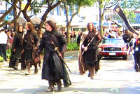 - Masked and hooded, walking single file down the trail