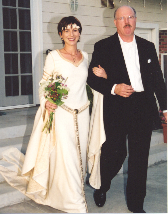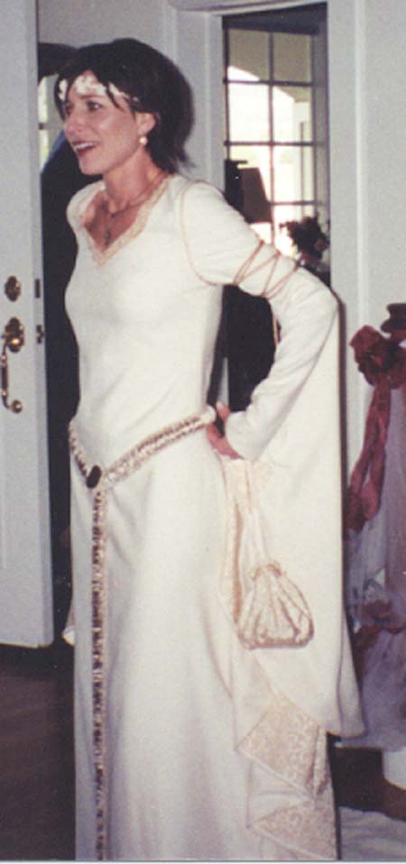 My seamstress used no pattern. She cut the dress freehand from the pictures I showed her. It is made with a fine white wool, lined with raw silk, and a gold patterned brocade lining sleeves and train. She added a longer train for the wedding, though if I had it to do again, I wouldn’t have the longer train. I preferred it as it was in the movie. Also, the dress was so heavy I had a hard time getting down the stairs. For the belt I used a flat woven cording. For the lining around the neck, we used a matte shimmery gold fabric overlaid with another woven trim that I found. It took forever to find just the right color, thickness and style for the cording. My seamstress cut the sleeves in one piece out of the wool. There is a zipper in the back.