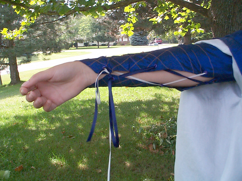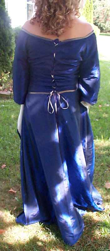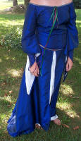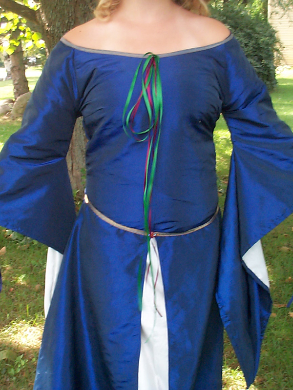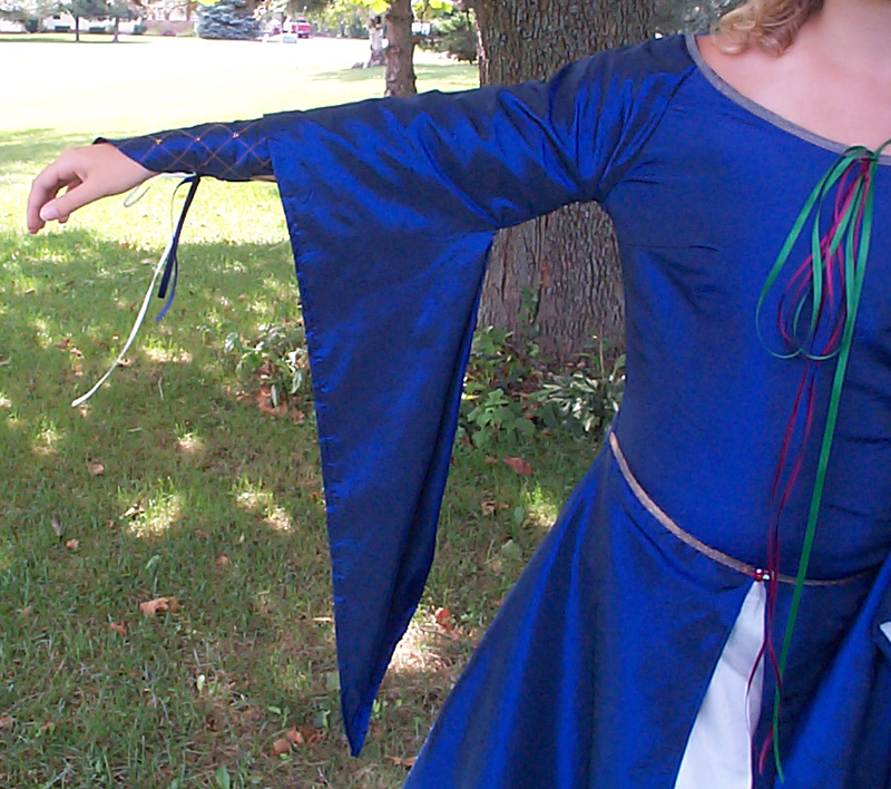 Rachael - Michigan, USADark Blue Elven DressI We used dark blue polyester taffeta for most of the dress. The right side of the fabric had velvet flowers all over it but we loved the color so we turned the fabric inside out. The cream parts are silk essence. The quilting on the undersleeve was done by machine. The rest of the ribbon (except for the neckline), beading and riveting was all done by hand. I used gold colored glass seed beads for the cross sections of the quilting. The red beads have a pearlescent or iridescent wash and look kinda like jewels. I drafted this pattern using many measurements and a little (read TONS) of patience. But all in all I am very happy with how it turned out. I hope that my fellow costumers and fans enjoy it too.