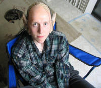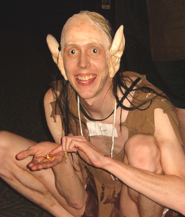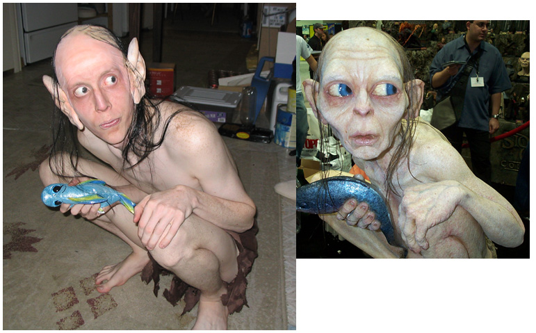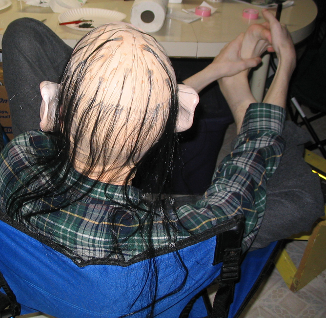 Finally on the big day, Squidtrek blended theatrical makeup to blend to his skintone, and "glued" all the pieces to Scott's head with more liquid latex (I can't recommend enough the use of liquid latex). Scott then took some darker makeup and smeared it on his body to simulate dirt and age spots. Originally we had purchased "sticky shoes" for Scott to wear on the big day, but with how active he was being, these proved pointless, so he just went barefoot for the day. The fish was purchased at a local store (you cannot fathom how hard it is to find a fake fish...took me over a month to find that), and the "elven rope" is 3 pieces of white yarn woven with silver thread that we braided together. I want to point out that Scott wore this "costume" in the middle of an Ohio December. Many people suggested to me that I purchase a skin colored bodysuit for him to wear to stay warm, but he was insistent...he has the most incredibly skinny body and pale skin, which was why we decided on this costume in the first place. He won first place in the costume contest, and was featured on CNN.com, Foxnews.com, and several local papers!