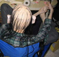 mixed a "mud" coloured paint and painted mud on the "loincloth." Scott wore a skullcap purchased locally that we hand-glued long black hair to from a cheap wig purchased after Halloween. We used liquid latex to "glue" the hair onto the skullcap, one piece at a time. The ears were actually