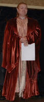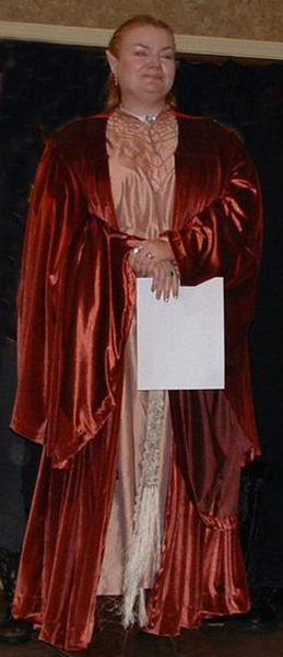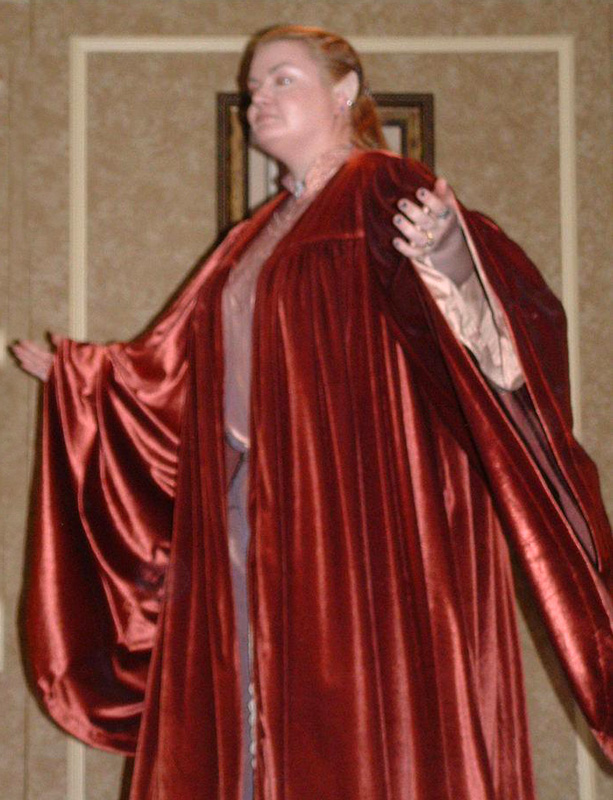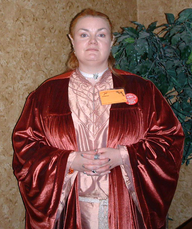Offhand I can't recall the basic patterns used, but we modified them anyway, to add a mandarin collar with a buttoned slit to the tunic, and some things like that. I can dig out the pattern when I get home, if you like. With the tunic embroidery, I reconstructed the design based on still photos, then found the design on your website and verified it against my reconstruction, and used it. The tunic does NOT have petaled hem; it has a straight hem, more like a dress. I thought this would be more in line with what Celebrian would wear. The petaled hem tunic is there for freedom of movement of the legs, as a warrior would need; consequently it didn't seem appropriate for Celebrian. At a later date, I plan to use fabric paint to recreate the burnout pattern found on the sleeves and shoulders of Elrond's robe. I may possibly also add a brocade collar and cuffs.